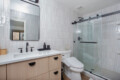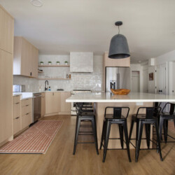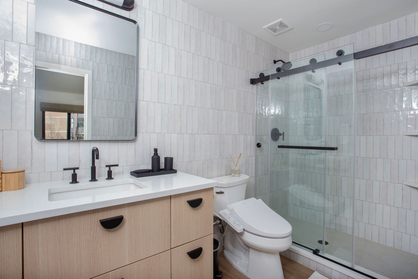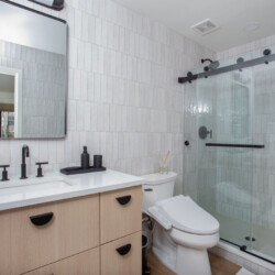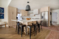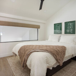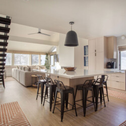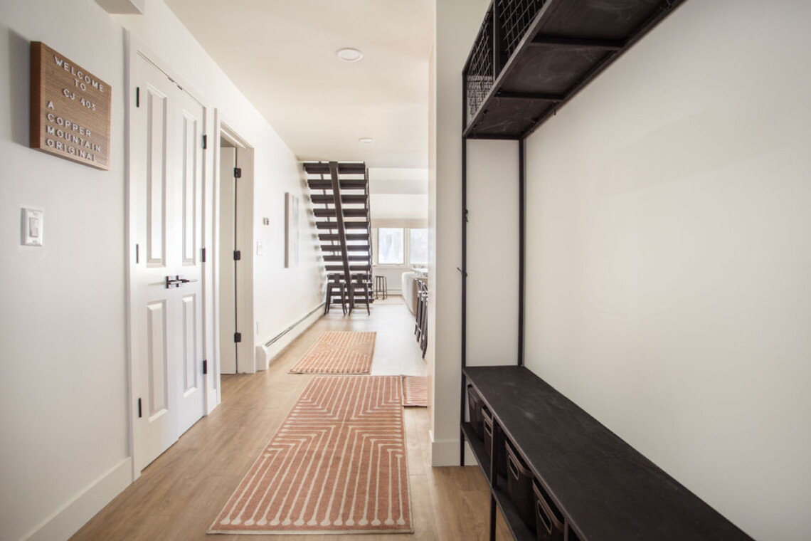 The chef-inspired kitchen embraces a Scandinavian sensitivity, while possessing all the modern niceties necessary for serious food preparation, including Kitchen Aid appliances, a Crockpot, Instapot, Sous Vide, griddle, waffle-maker, and two coffee makers (K Cup and pot version). The 42-square foot dining surface comfortably seats 12 and sits under a perfectly appointed pendant. The living room sports the perfect mountain couch, chosen to specifically fit the room. Lounge next to the oversized slope-side window reading a book, watching a game or listening to laughter from the villagers below. Of course, apres skiing at Copper while staying in Copper Junction provides the ultimate in leisure and convenience. Just below the condo sits Eagle BBQ dishes smoked brisket rivaling anything coming out of Texas. From the living room, the beautiful custom stairs lead you into the upstairs family area with a 12-foot pitched ceiling. Two bedrooms with storage beds and custom closets sit adjacent to two modern bathrooms with artisan tile. The European-inspired sink allows for maximum efficiency of this family space, and the custom bunk beds are each equipped with a plug and an individual light for optimized privacy and comfort.