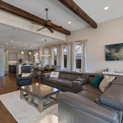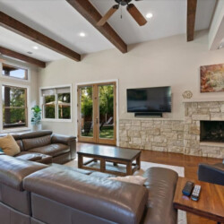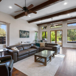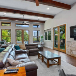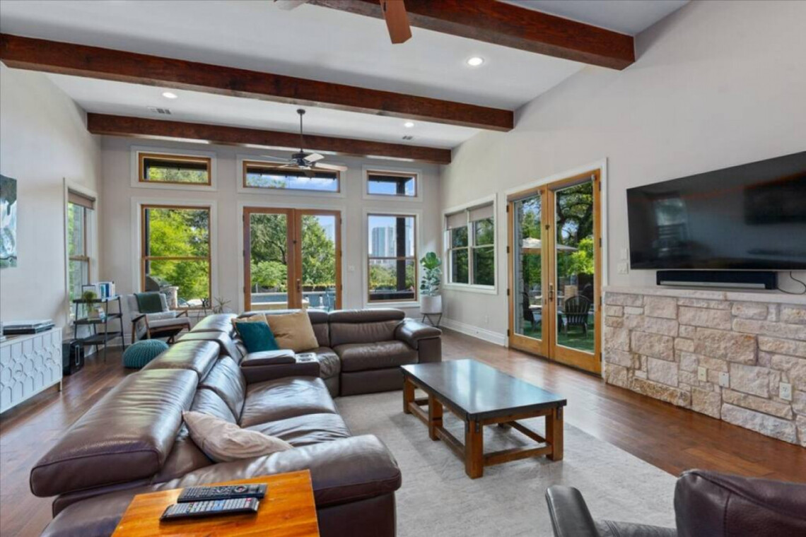 Living room is huge with 14 foot ceilings, large windows and multiple 9 foot glass French doors that open to the backyard and amazing city views. The centerpiece of the room is a large modern leather sectional with electric reclining seats, leather captain chair, 65 inch 4k TV and Sonos surround system.