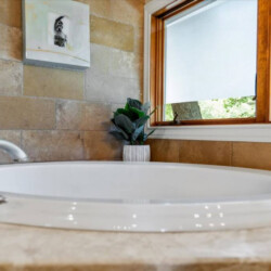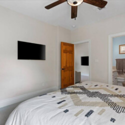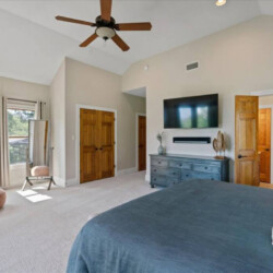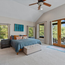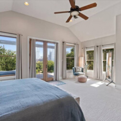 Primary suite “El Presidente” is oversized with vaulting ceilings and large glass doors that open to a large covered deck with outdoor living and the best view in Austin. The ensuite bathroom has a walk in shower and separate jacuzzi tub, dual vanities, bidet, and large walk-in closet.