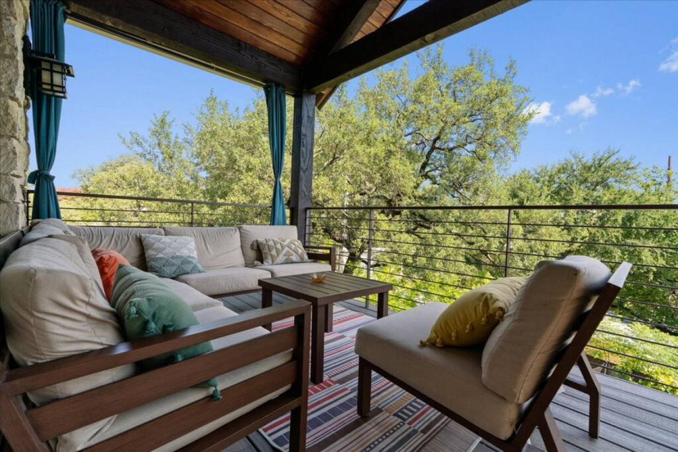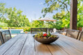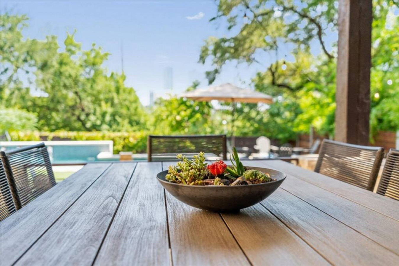 Outdoor dining is covered and has a large teak farmhouse table and views of downtown.