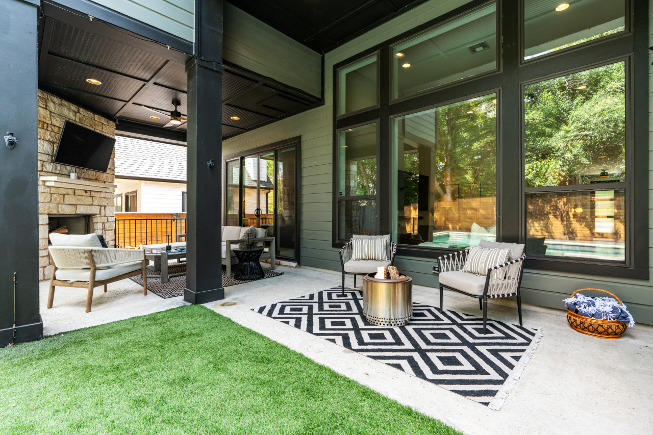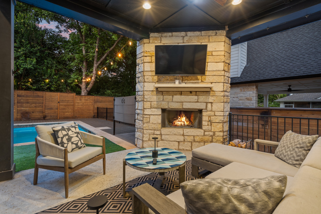 Outdoor entertainment area with fire pit, grill, and outdoor TV.
