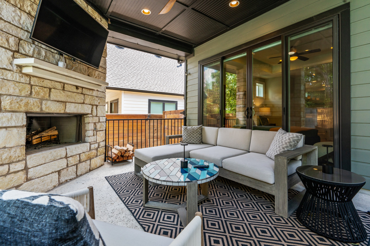 Outdoor Entertainment Area: Fire pit, gas grill, outdoor TV, and comfortable seating—ideal for group gatherings and relaxation.